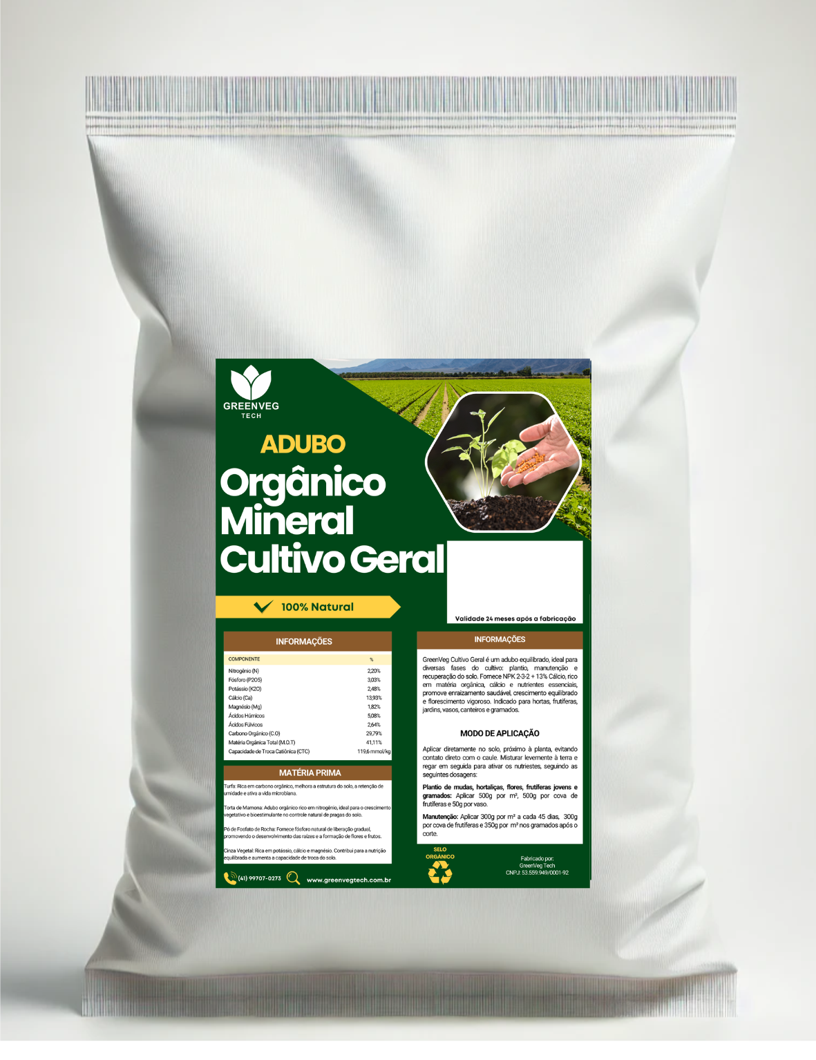 O GreenVeg Cultivo Geral é um adubo orgânico balanceado, ideal para diversas fases do cultivo: plantio, manutenção e recuperação do solo. Sua fórmula fornece NPK 2-3-2 + 13% de cálcio, com alta concentração de matéria orgânica e nutrientes essenciais que favorecem o enraizamento saudável, o crescimento equilibrado e o florescimento vigoroso das plantas.