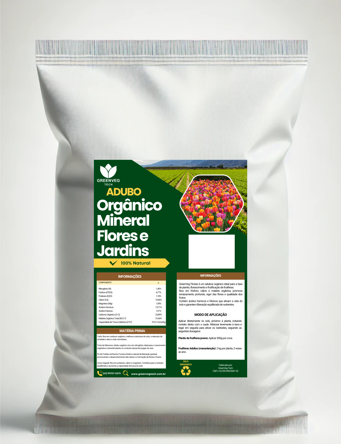 O GreenVeg Flores e Jardins é um adubo 100% orgânico, especialmente formulado para flores, canteiros e plantas ornamentais. Combinando uma alta concentração de fósforo, cálcio e matéria orgânica, é ideal para estimular a floração, intensificar a coloração natural das flores, fortalecer as raízes e promover plantas mais saudáveis e resistentes.
